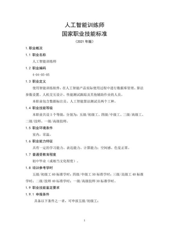 为贯彻落实《关于深化人才发展体制机制改革的意见》,规范从业者从业行为,引导职业教育培训方向,促进相关从业人员提升职业素养、推动经济社会全面发展,根据《中华人民共和国劳动法》有关规定,人力资源社会保障部联合工业和信息化部组织有关专家,制定了《人工智能训练师国家职业技能标准(2021年版)》(以下简称《标准》)。