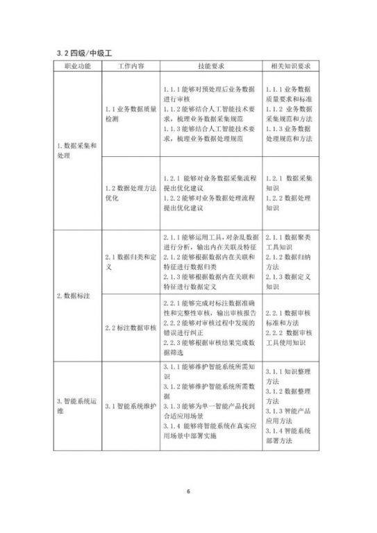 本次发布的《标准》,从数据采集和处理、数据标注、智能系统运维、业务分析、智能训练、智能系统设计等维度划分了L5-L1的五个等级,并对各个等级的职业能力给出了具体的描述和要求,为人工智能训练师这一新职业提供职业发展指引。