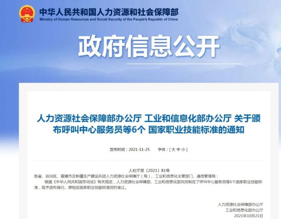 根据《中华人民共和国劳动法》有关规定,人力资源社会保障部、工业和信息化部共同制定了呼叫中心服务员等6个国家职业技能标准,于2021年10月21日发布【人社厅发〔2021〕81号】文颁布施行。原相应国家职业技能标准同时废止。