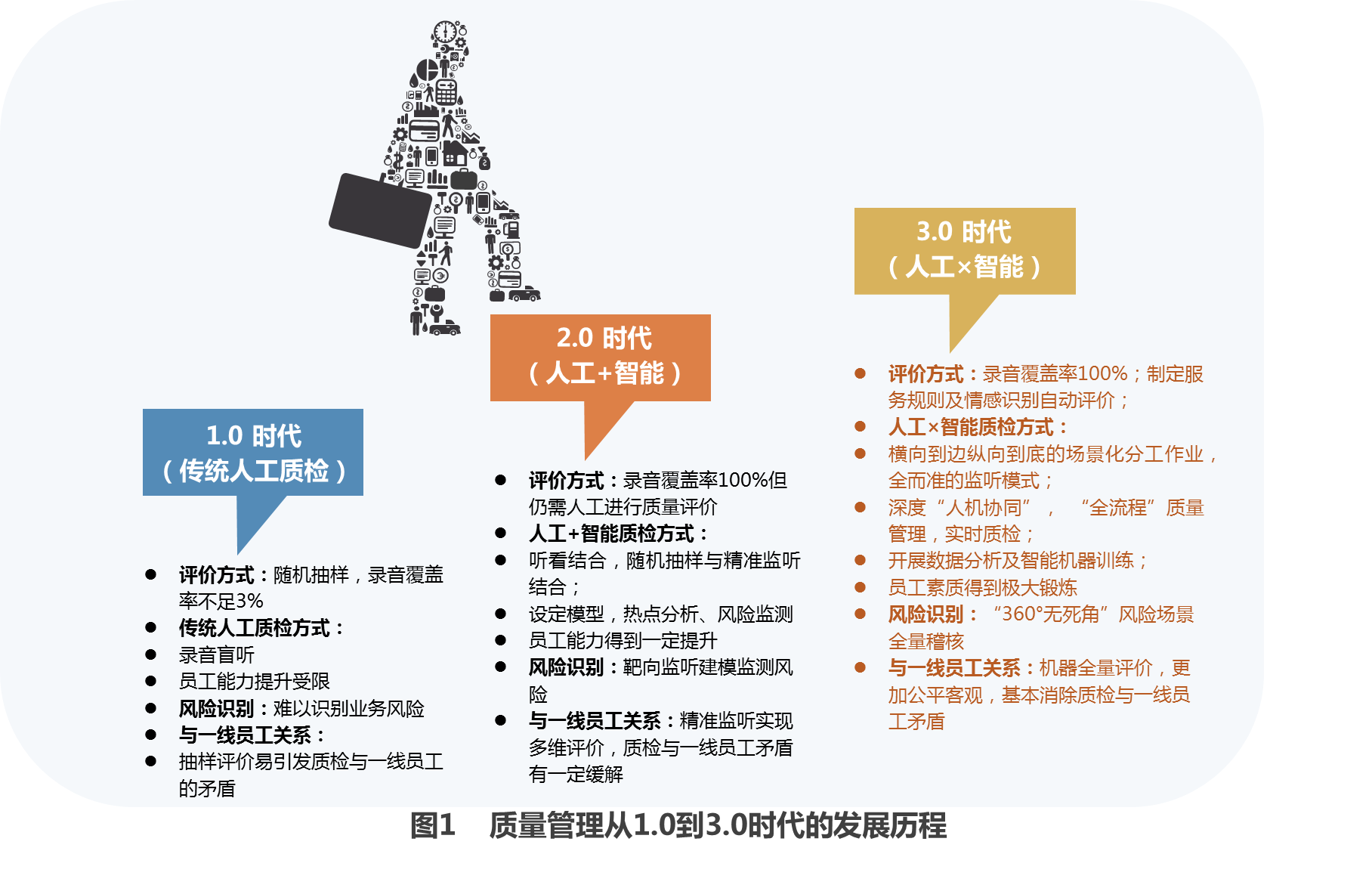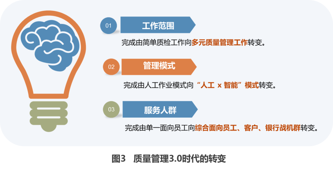 随着互联网、移动支付和人工智能的发展,客户需求入口多样化,用户体验追求不断提升,对远程银行的质量管理工作带来新的冲击与挑战。智能语音、声纹识别、人脸识别等技术在智能客服中的应用也促使远程银行的质量管理从2.0时代(人工+智能)向3.0时代(人工×智能)转变,暨通过推进横向到边、纵向到底的场景化分工作业模式,形成深度“人机协同”的质量管理模式。