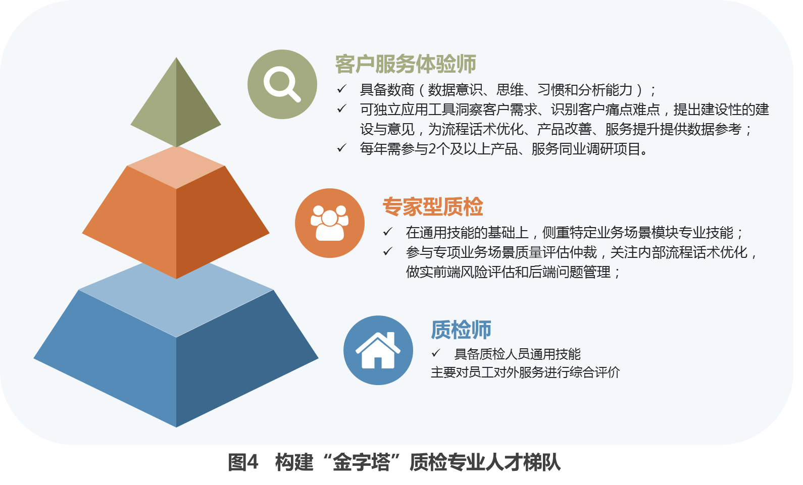 1.构建“金字塔”质检专业人才梯队。在外部环境“天时”和内部发展基础“地利”兼备的背景下,“人和”成为关键。转型发展需大力培养专业人才,在内部构建“质检师-专家型质检-客户服务体验师”人才梯队,加大人才支持力度,确保质检师在具备质检通用技能的基础上不断提升综合素质与专业技能,向“专家型质检”及“客户服务体验师”进阶(图4)。