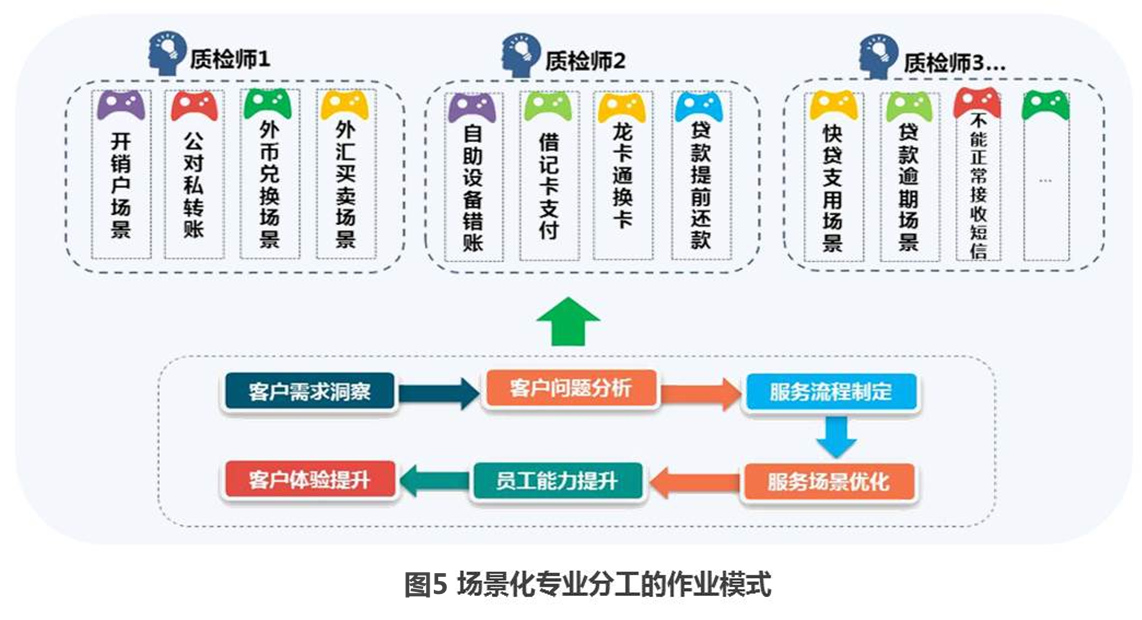 2.实行场景化专业分工作业模式。在通用技能基础上,将质检师按业务场景分模块,实行场景化专业分工,打造“责任田”工作模式。每位质检师在所属“责任田”中均需具备“客户需求洞察-客户问题分析-服务流程制定-服务场景优化-员工能力提升-客户体验提升”等能力。通过不同服务场景切入,将员工定位专家化,以一专多能的培养模式来储备复合人才。通过阶段性专攻某领域,做深研透该领域的客户需求、关键风险点、服务提升要点,成为该领域的专家型人才(图5)。