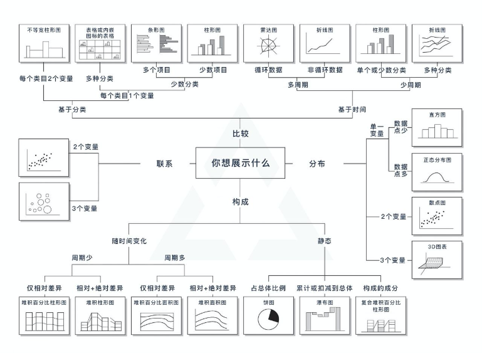 选择好需要展示的数据,那么如何表达这些数据就需要使用图表来展示,对于不同的数据有不同的展示方式,首先我们从功能角度对图表进行分类(图4)。