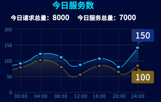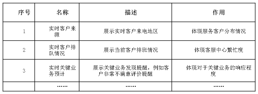 2、实时服务数据:由于是大屏监控除了基础的汇报或展示性数据外,参观者还需要看到在参观的当时数据变化的情况,结合实际看到的服务场景形成深刻的记忆,这些数据就包括但不限于表2内容。