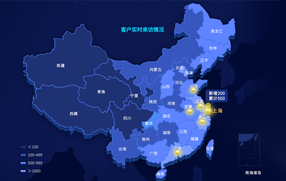3、实时地图:快速展示实时客户来访情况,主要为科技感担当。