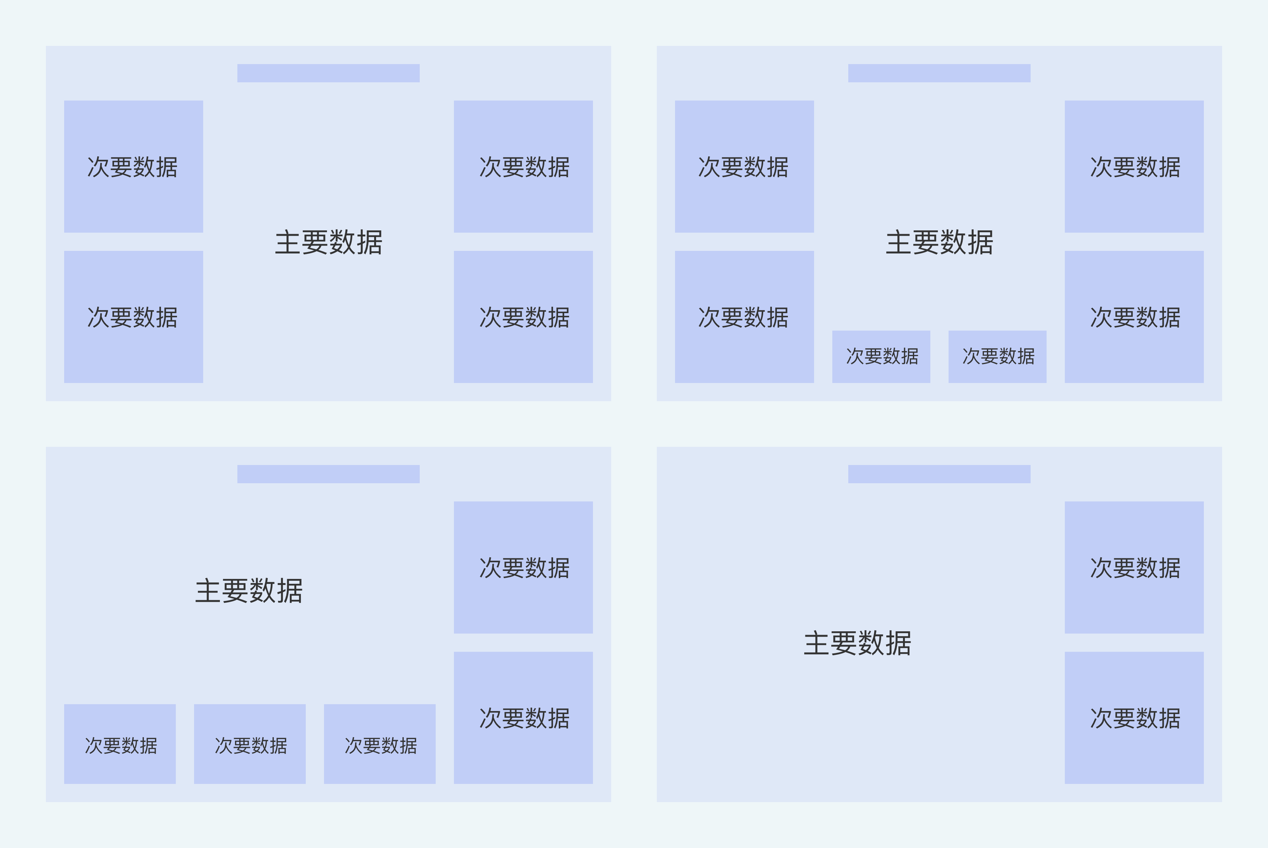 尺寸及数据样式确立后,接下来要对设计稿进行布局和页面的划分。如何将主要数据、次要数据和辅助数据在画布上进行布局呢?我们有一些常见的结构:(以1920*1080尺寸,布局示例)。