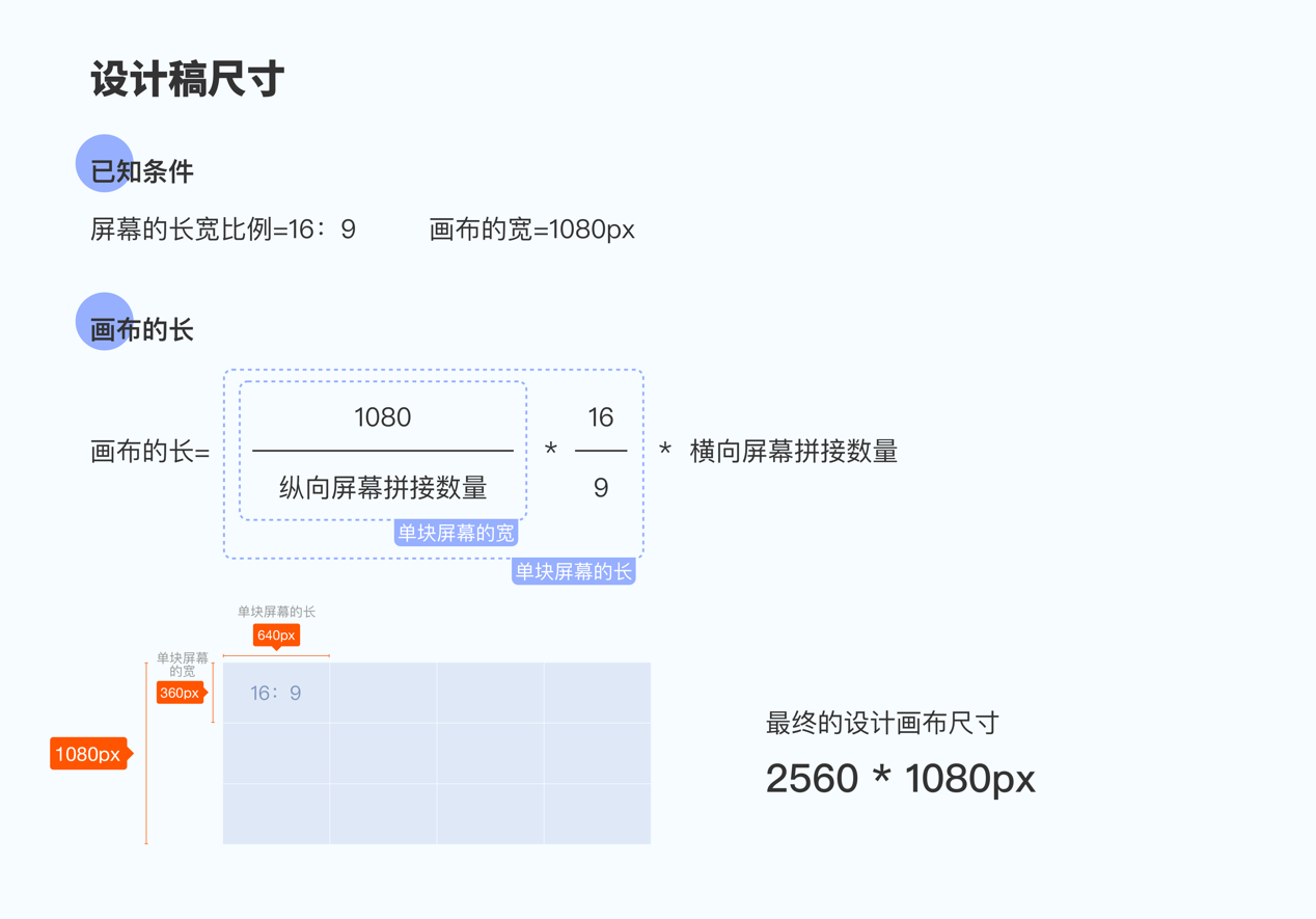 比如我们使用3*2的拼接屏,可以通过一块屏幕为 1920*1080 去计算,那么通过计算分辨率应该是 1920*3 &1080*2,也就是5760*2160,但是假如我们用软件创建这么大的画板,势必会加重电脑的卡顿。因此我们根据1080P屏幕先确定好整个拼接屏的宽是1080,长宽比例是16:9,通过计算公式得出整个拼接屏的长(图11)。