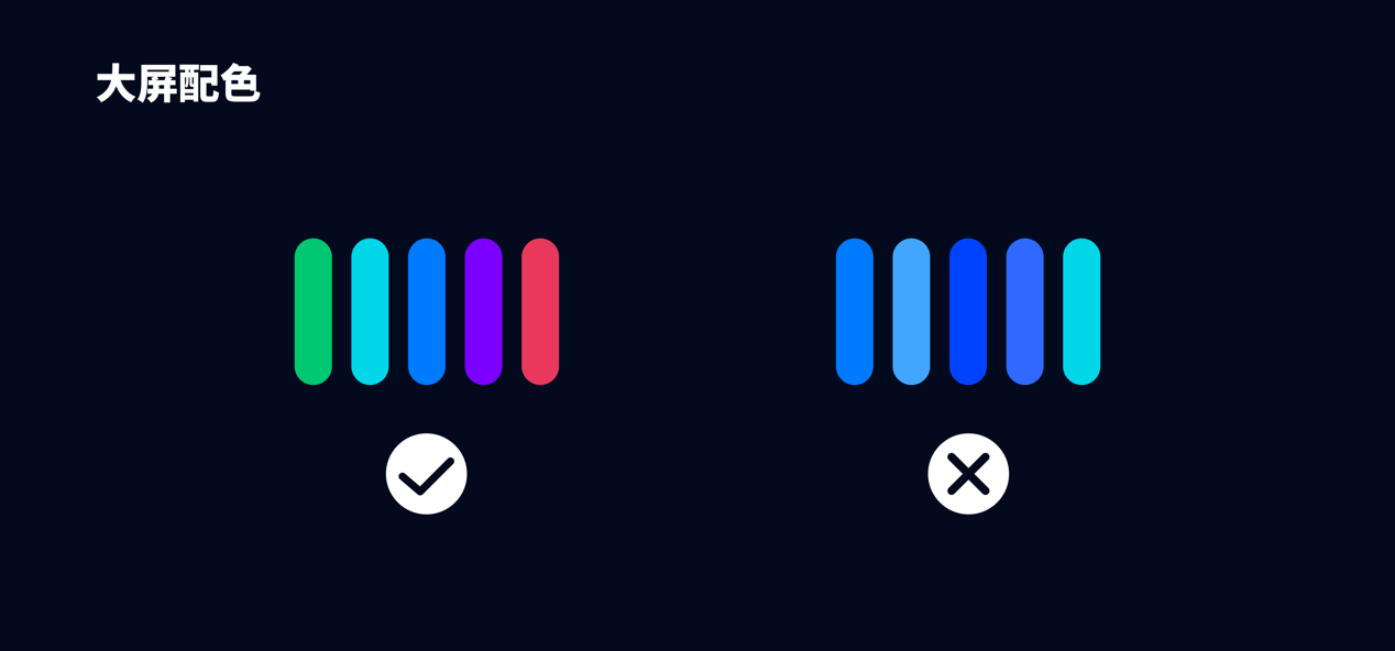渐变色慎重使用。大屏普遍色域有偏差,显示偏色,因而使用渐变色需要根据大屏反馈确定是否调整,纯色最佳。