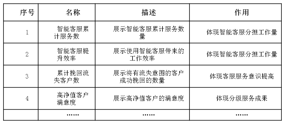 3、进阶服务数据:同时客服中心在最近几年的不断发展在传统人工服务的基础新增了智能客服服务、主动营销服务、高净值客户1对1服务等;在大屏展示中均可以进行体现以便告知参观者新型技术带来的变革与成功,这些数据就包括但不限于表3内容。