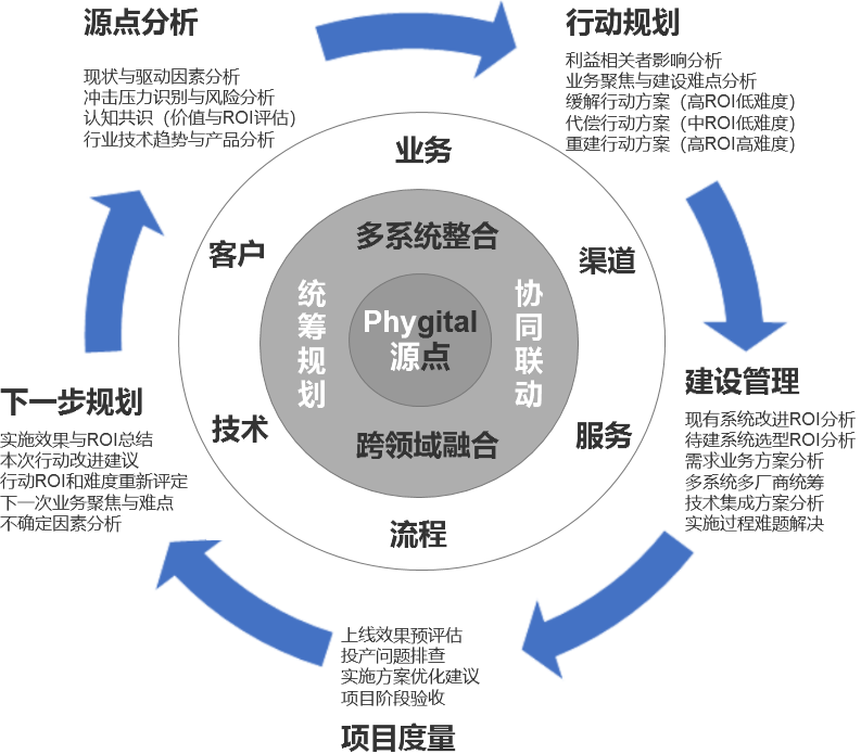 过去的项目建设,很多都是“交钥匙”工程,甲方只需选择1-2家平台厂商,加上一家口碑好的集成商,剩下的就交给经验丰富的项目经理即可。建设数实相生的客户新世界,工程建设复杂,涉及到众多产品,目前很难找到ALL IN ONE,而且涉及到众多现有系统的改造和对接,需要多方参与,建设周期长,很多需要边建设边投产。所以整个建设过程,会越来越类似大型工程建设项目,需要经历规划期、建设期和运营期。