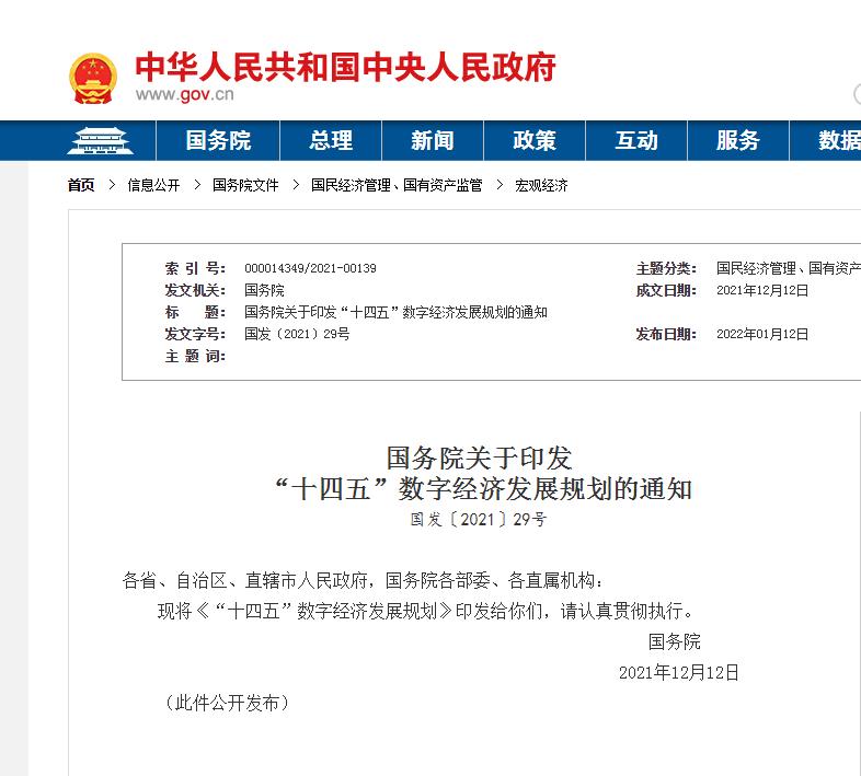 国务院关于印发 “十四五”数字经济发展规划的通知
