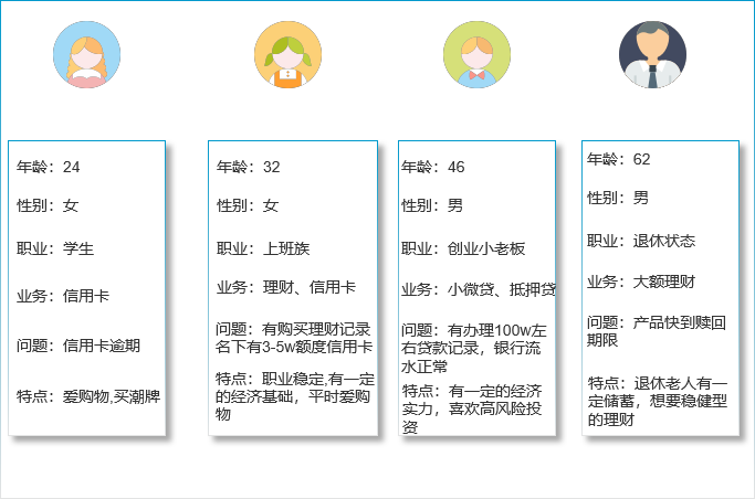 通过图1可以明显的看出不同用户在自己的职业、年龄、以及所办理的业务,都有不同的问题和特点,金融行业的智能服务利用用户的特点,分别向其提供差异化的服务,比如年龄62岁退休的王先生,仅靠退休金养老,现在在某某商业银行存款200w以上,这种高净值VVIP用户,肯定是银行重点的营销对象,推荐他购买各种稳健型的理财。在比如年龄24岁职业为学生的王同学,喜欢买潮牌,玩游戏,最多给他推荐一个储蓄罐的产品,可以让他定期理财。上面的两个例子说明银行也会根据用户在企业内部所属的画像,向他们提供个性化的服务。