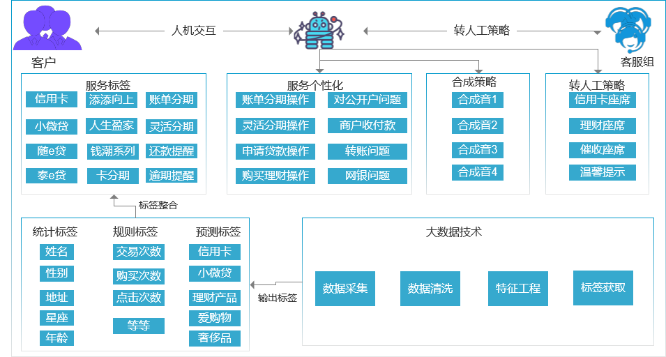 移动互联网、大数据、云计算等技术的发展,使得金融服务从以产品为中心逐渐转向以消费者为中心。据数据表明80后、90后以及00后已经占据整个消费的主力,追求的产品服务也逐渐由高性价比、品牌化转变为多元化、个性化趋势,更需要企业细分客群,不断的创新产品设计。传统的智能导航服务采用扁平化的菜单模式,需要用户输入数字进入指定的服务模块,对于容忍度比较低的年轻客群,估计是从入门到放弃,产生一定的情绪价值。那么企业如何利用内外部的数据,整合用户标签形成贴合业务场景的用户画像,提供“千人千面”的智能导航服务,是企业探索的目标。