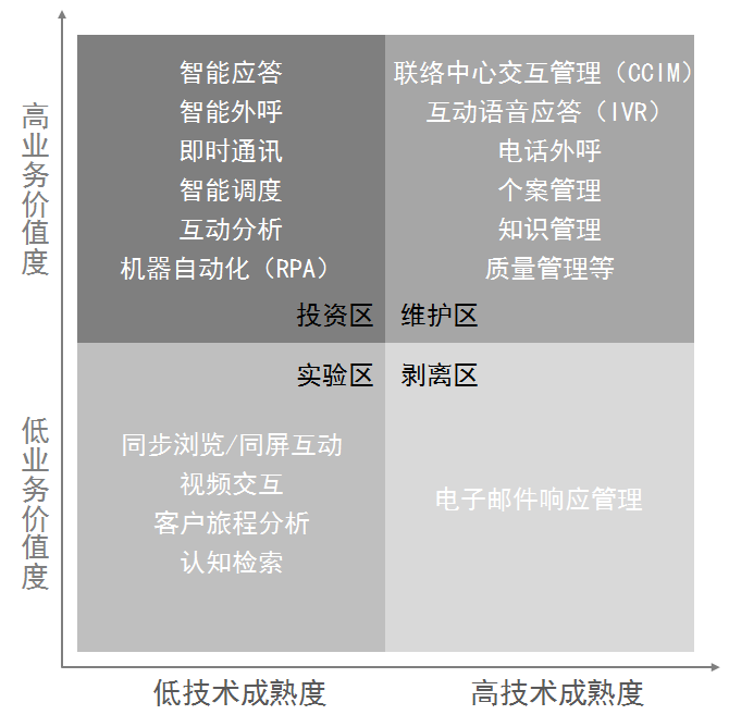 用业务价值度(指该项技术投资在合理生命周期内的预期回报)与技术成熟度(指与该项技术发展相关的创新速度、市场主导地位厂商性质以及企业用户使用情况等)两个维度搭建一个矩阵,对目前客服领域约20项主流的技术进行状态分析和策略规划,四个象限分别为维护区、投资区、实验区、剥离区[2]。RPA+AI技术组合正处于四个象限中的 “投资区”,低技术成熟度和高业务价值度是在投资区技术的特点,这些技术经过一定发展已经达到客服中心可以放心投资应用的程度,也是客服中心转型的重要驱动力,助力客服中心激增保存、降本增效,通过技术对资源密集型生产方式进行创新升级(图2)。