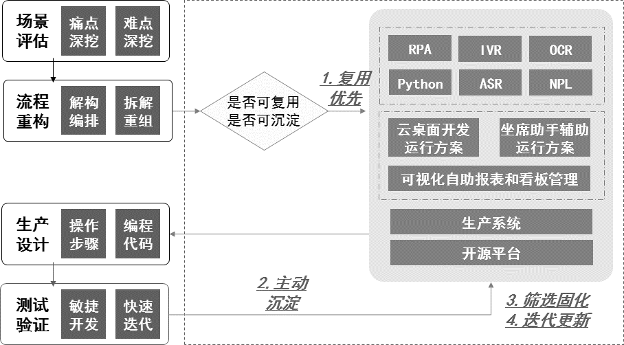 最后,对标业界RPA COE卓越中心管理目标,进一步完善人机协同数智客服的运营管理模式,通过“复用优先、主动沉淀、筛选固化和迭代更新”的中台思维,不断扩充RPA、Python、IVR、ASR、OCR、NLP等AI赋能的数智客服生产能力,适配更多长流程业务场景生产需要(图7)。