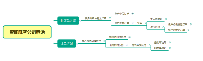 其次,存在订单情况下,会存在哪些重点影响查询结果输出的内容,进行下一步细化和引导,最后根据条件,输出对应航空公司号码或者引导用户自助查找,如图2。