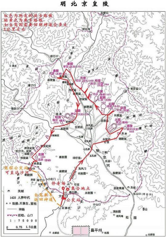 计划是完整经过十三个明陵,每个陵讲讲皇帝历史,时间有限路上需保持五公里每小时的速度,对体能有一定要求,如不能完成不要勉强,避免受伤,全程可自行打车或乘公交下撤至起点,具体路线见附图。
