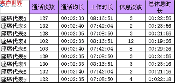 上面这张表格,画出的就是9个座席代表的话务数据情况,分别列出了通话次数、通话均长、工作时长、休息次数、总休息时长这五个KPI指标,你可以看的出来是哪一个座席代表在忽悠他吗?