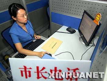 2007年7月26日,嘉兴市长热线工作人员在接听热线电话。 当日,浙江省嘉兴市将劳动保障局、卫生监督局、工商局、城管办等部门的21条政府服务热线全部整合进12345市长热线中,市民只要拨打市长热线电话,就能得到这21个政府部门的服务和咨询。