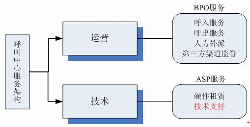 如上图所示,运营和技术是呼叫中心最核心的两大板块。BPO(Business Processing Outsouring) 服务,就是我们所说的商业流程外包,对于呼叫中心市场来说,已经发展得相对成熟,市场上各大外包呼叫中心都可以为企业提供全面的BPO外包服务,仅限于提供服务的能力和提供服务质量不同。BPO服务帮助企业的项目管理人员节约管理时间、节约成本开销、节约项目开销;而ASP服务又能为企业带来什么呢?从技术层面上讲,ASP服务内容包含了硬件和软件两大块,但是人们往往忽视了ASP服务在软件技术支持方面的应用。如果说BPO服务解放了企业的项目管理人员,那么ASP服务的技术支持则帮助企业的技术人员从繁琐的技术支持中解放出来。