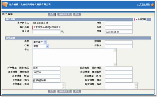 客户类型部分让人有些疑惑,如果选择为潜在客户,保存后并不在菜单“潜在客户”中出现,仍出现在“客户”中。也就是说:客户类型中的潜在客户和菜单条上的潜在客户意义不同,这容易给用户带来混淆,估计是在本地化过程中出现的翻译歧义。