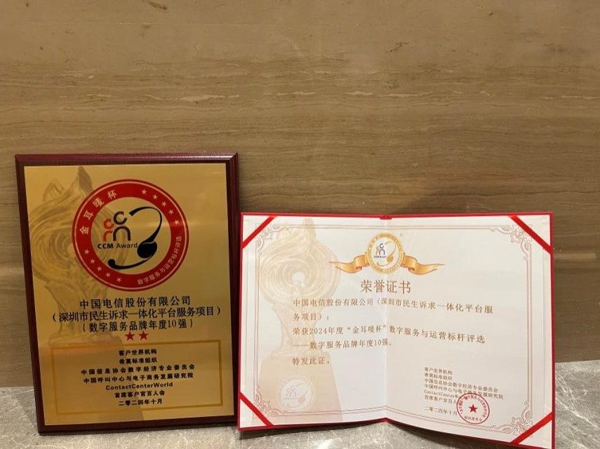 中国电信股份有限公司(深圳市民生诉求一体化平台服务项目)荣获2024“金耳唛杯”数字服务与运营标杆评选—-数字服务品牌年度10强