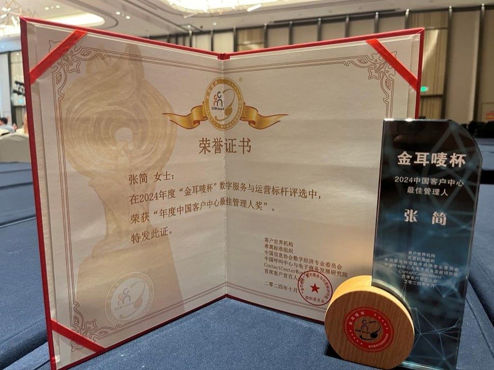 中国电信深圳分公司政企智慧客服运营中心总经理张简女士荣膺“2024年度中国客户中心最佳管理人奖”。