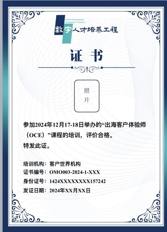 参加全程培训并考核通过学员获得由中国信息协会数字经济专业委员会联合客户世界机构共同办法的“数字人才培养工程:出海客户体验师”培训证书。可在主办单位官方网站进行查询。