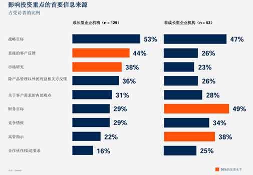 成长型企业将直接的客户反馈和市场研究作为确定投资重点的第二和第三重要信息来源。而停滞型企业则根据财务目标和高管指示来确定投资重点。