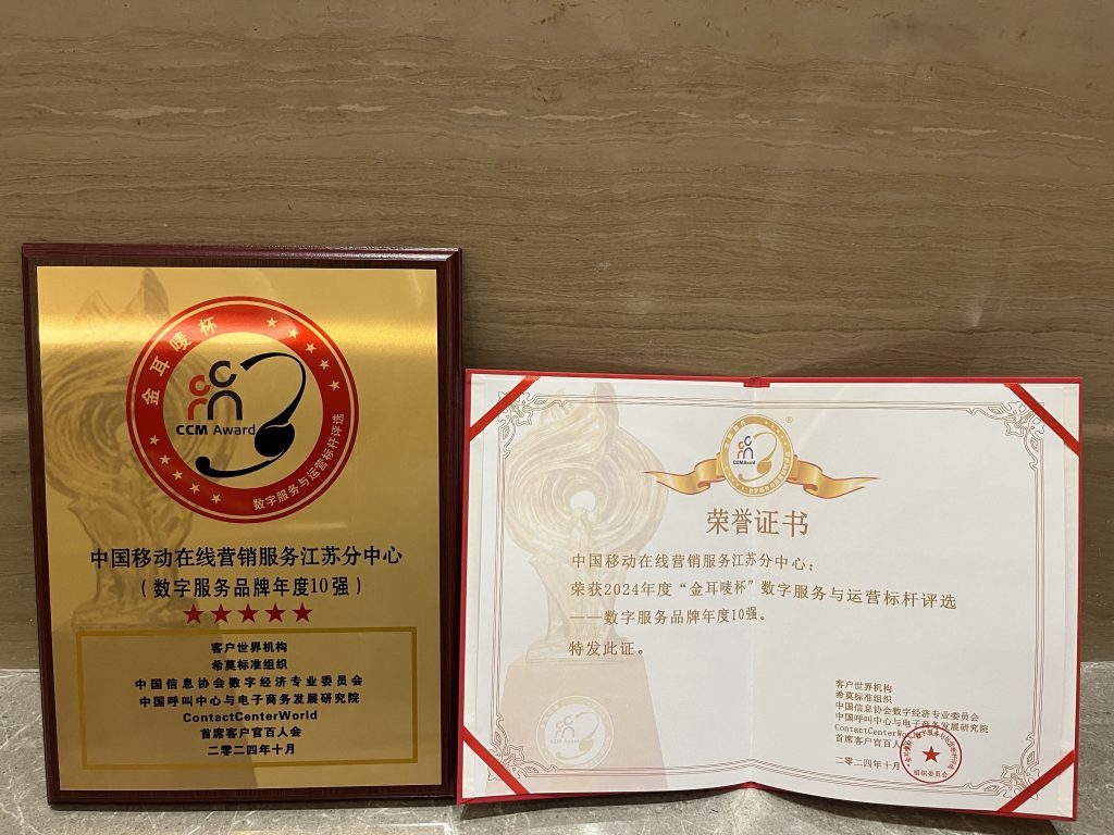 - 中移在线服务有限公司荣获2024“金耳唛杯”数字服务与运营标杆评选—客户服务年度10强奖