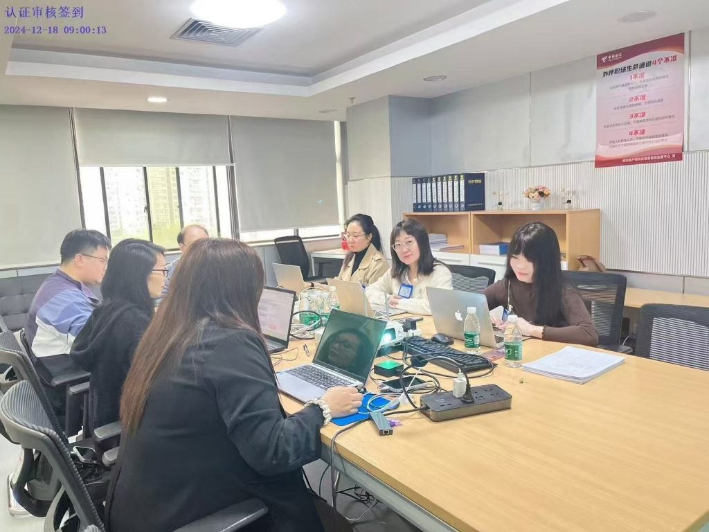 2024年12月20日,客户世界消息:北京希莫认证服务有限公司(以下简称:希莫认证)于12月18-19日在中国电信股份有限公司深圳分公司(以下简称:深圳电信)项目现场依据《信息技术服务 数字化转型成熟度模型与评估》国家标准(GB/T 43439-2023)对该公司实施了国标服务认证工作。本次认证工作以现场实施的方式进行,希莫认证派出“国家服务认证审查员” :葛梅(组长)、潘江玲和刘璐玥负责全程认证工作,深圳电信负责人及数字化转型项目小组全体成员接待并全面配合了认证审查工作。