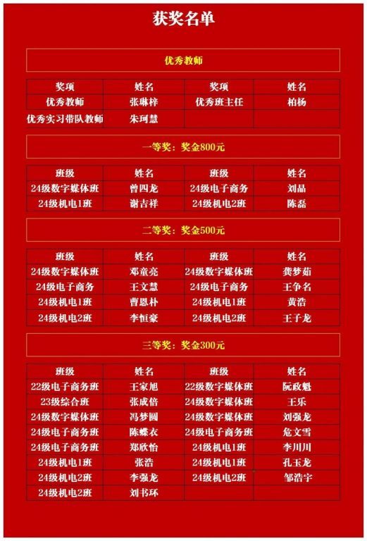 在主持人的热情介绍下,一系列荣誉奖项逐一揭晓。其中,“优秀班主任”、“优秀教师”以及“优秀实习带队老师”等奖项,不仅是对获奖教师辛勤耕耘的肯定,更是对全校教职员工不懈努力与卓越贡献的崇高致敬。