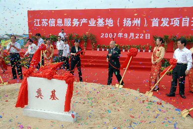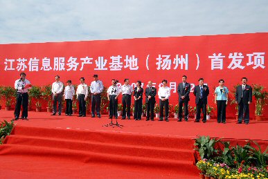 日前,江苏信息服务产业基地(扬州)首发项目开工典礼在广陵新城隆重举行,这标志着产业基地建设迈入了实质性阶段。扬州市人民政府市长王燕文和天津泰达公司董事长刘惠文为奠基石揭幕,市委常委、常务副市长王荣平致贺词,江苏省信息产业厅副厅长龚怀进出席了开工典礼。