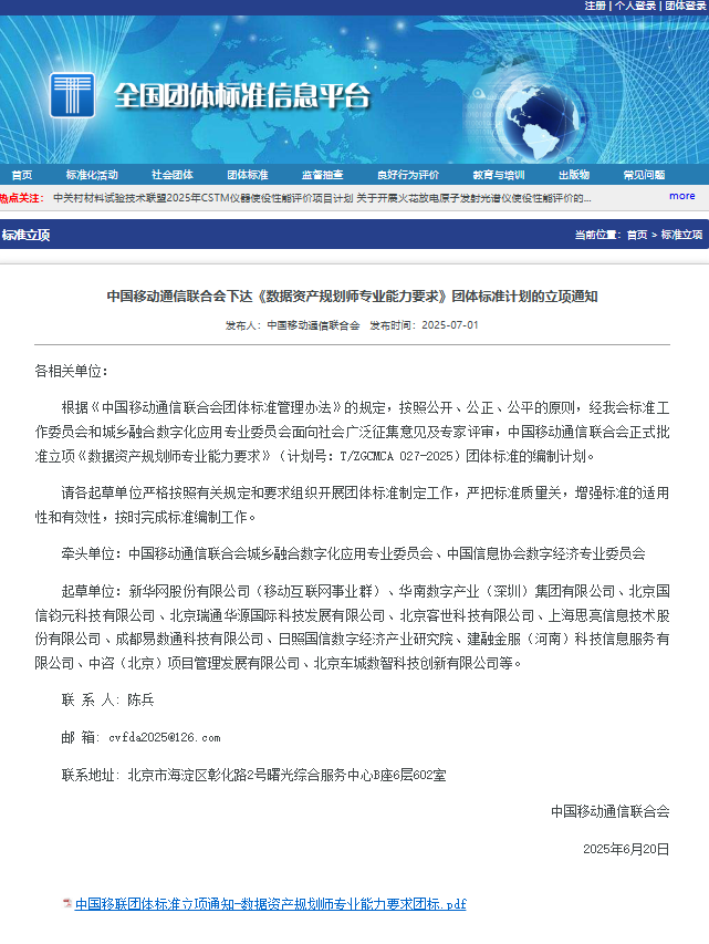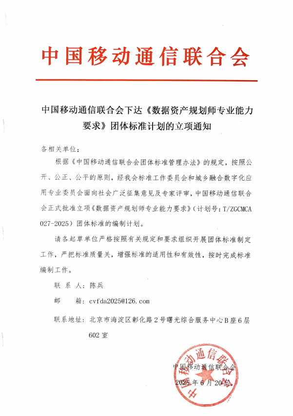 在国家加速推进数据要素市场化配置改革、发展新质生产力的战略背景下,一项旨在奠定数据要素价值释放人才基石的重大标准制定应运而生。中国移动通信联合会近日正式下达《数据资产规划师专业能力要求》(计划号:T/ZGCMCA 027-2025)团体标准立项通知。北京客世科技有限公司(以下简称“客户世界机构”)凭借其在数据要素价值化领域的深厚积淀与前瞻实践,被遴选为该国家级团体标准的核心起草单位之一。将以其在数据要素价值化领域的领先实践,为国家《数据资产规划师专业能力要求》这一关键标准的制定贡献核心力量。