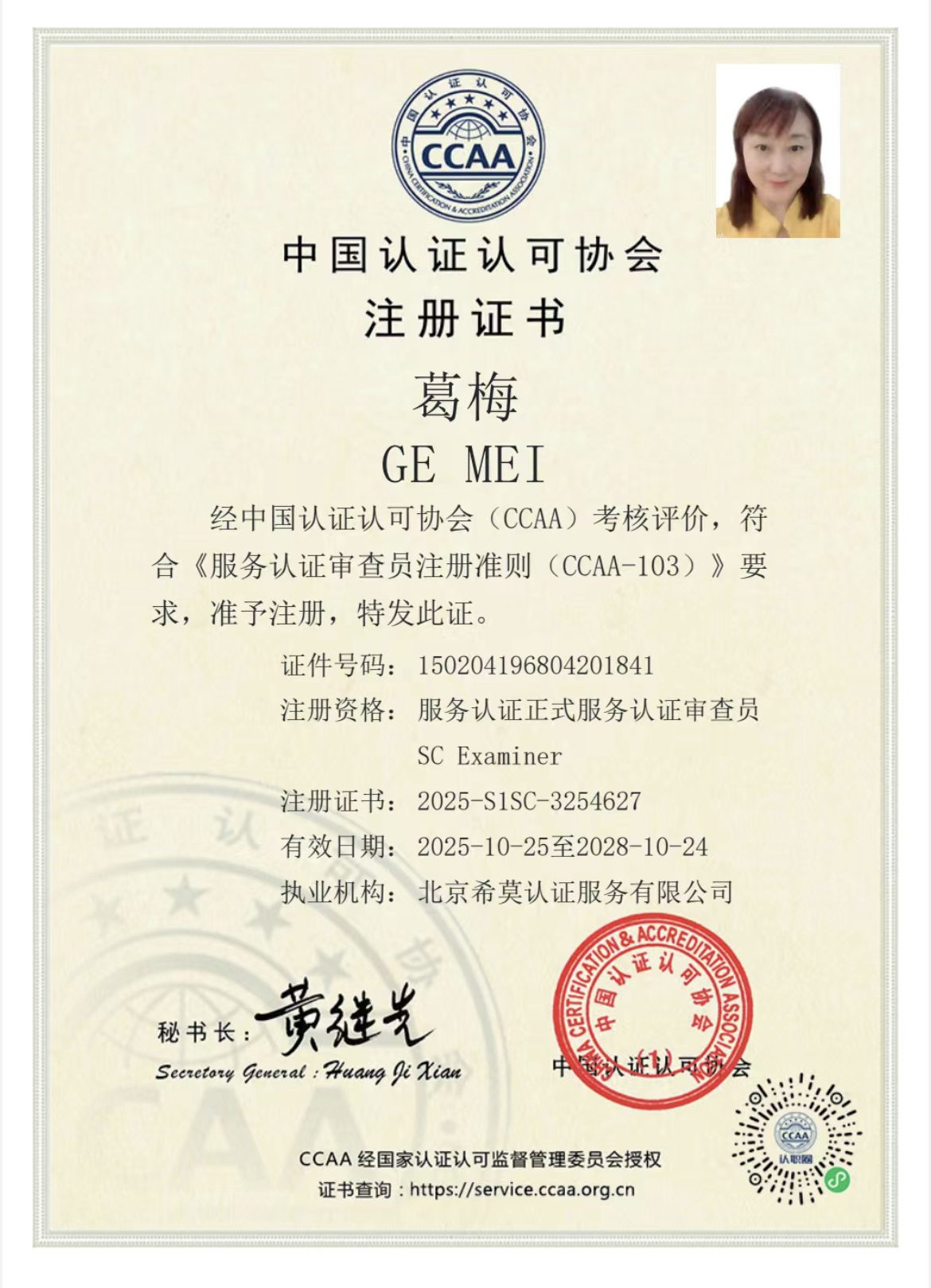 北京希莫认证服务有限公司(CMM Certification)是一家专门从事服务认证的专业认证机构,其认证领域涉及电信服务、信息检索及数字运营等范畴。是经国家认证认可监督管理委员会审批、授权、并颁发资质证书的合法认证机构(批准号:CNCA-R-2019-525),在国家市场监督管理总局的监管下,从事国标服务认证业务。北京希莫认证服务有限公司按国家认监委要求,从事认证的人员均为考试合格,并在国家认证认可协会备案,具有国家服务认证审查员资质的CCAA审查员。