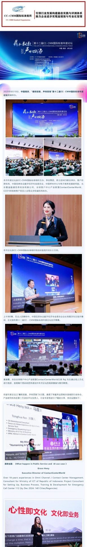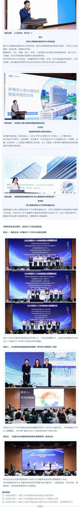 2025年6月10日,南京。客户世界消息:主题为“羲和驭数,声传四海” 的第十二届CC-CMM国际标准年度论坛在南京圆满举行。迄今为止,该年度性学术论坛已经在深圳、新加坡、台湾、上海、合肥、天津、泰安、贵阳、厦门、日照、南京等境内外城市成功举办了十二届。历届论坛得到国家相关部委指导,得到中国信息协会数字经济专业委员会、中国呼叫中心与电子商务发展研究院、全球呼叫中心产业联盟 ContactCenterWorld、CCO100 首席客户官百人会、以及全国各地服务外包及数字贸易协会等机构及各属地政府的大力支持。