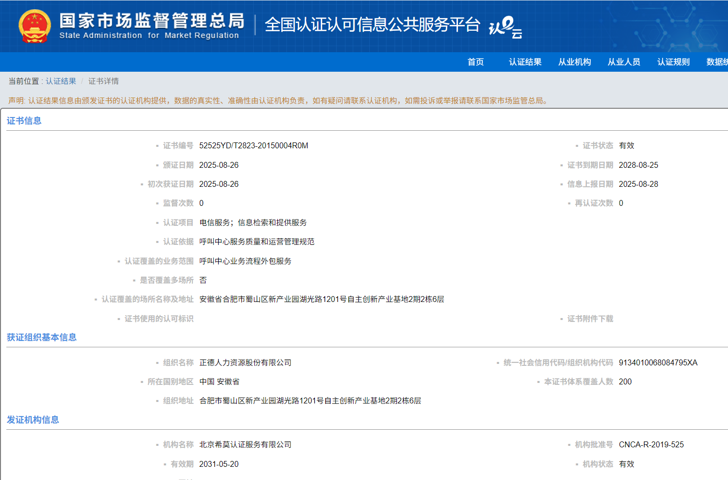 官网可查询的认证结果公示截图