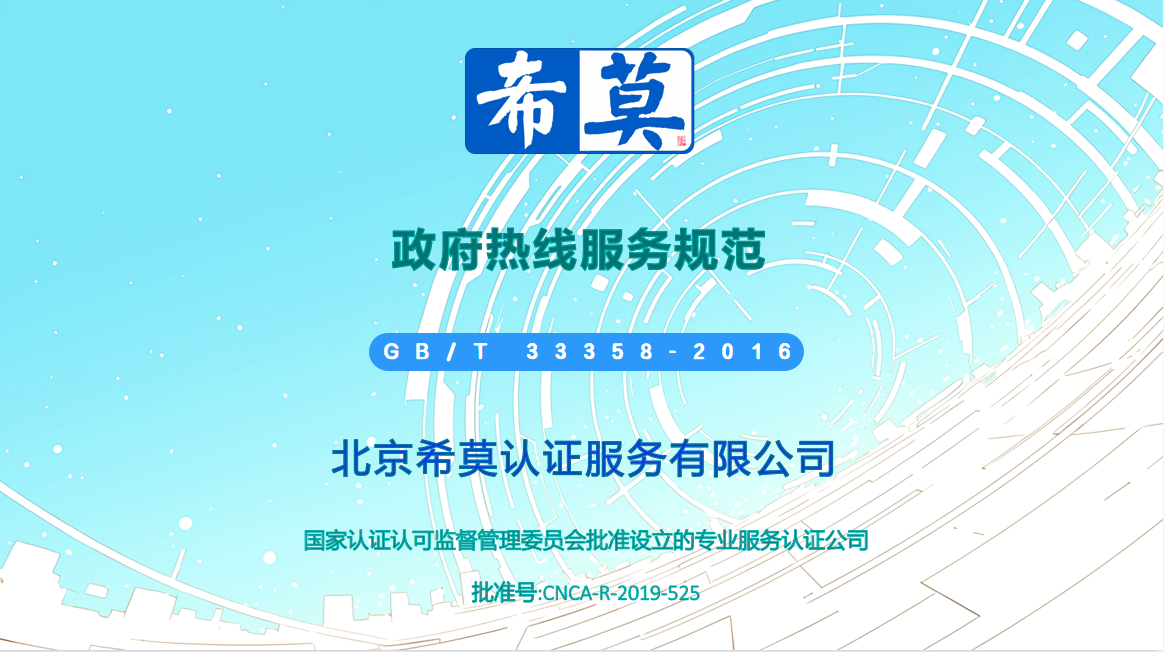 北京希莫认证服务有限公司(CMM Certification)是一家专门从事服务认证的专业认证机构,其认证领域涉及电信服务、信息检索及数字运营等范畴。是经国家认证认可监督管理委员会审批、授权、并颁发资质证书的合法认证机构(批准号:CNCA-R-2019-525),在国家市场监督管理总局的监管下,从事国标服务认证业务。北京希莫认证服务有限公司按国家认监委要求,从事认证的人员均为考试合格,并在国家认证认可协会备案,具有国家服务认证审查员资质的CCAA审查员。