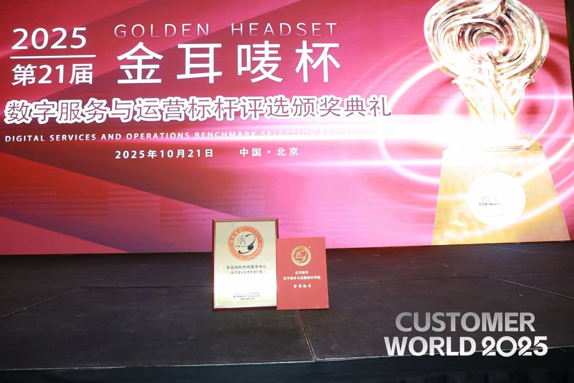 2025 年 10 月 21 日,备受行业瞩目的 2025 客户世界年度大会暨第 21 届 “金耳唛杯” 数字服务与运营标杆颁奖典礼在北京新世界酒店盛大举行。在这场汇聚了国家电网、中国邮政、中移在线、联想等众多知名企业的行业盛会中,青岛地铁热线服务中心凭借在数字服务领域的卓越表现,成功斩获 2025 “金耳唛杯” 数字服务与运营标杆评选 – 数字服务品牌年度 10 强奖,再次彰显了其在国内数字服务领域的领先地位。