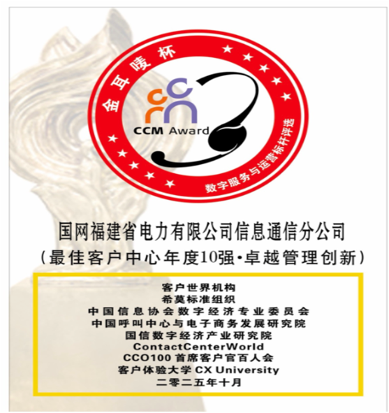 转载请注明来源:国网福建省电力有限公司信息通信分公司荣获2025“金耳唛杯”数字服务与运营标杆评选-最佳客户中心年度10强