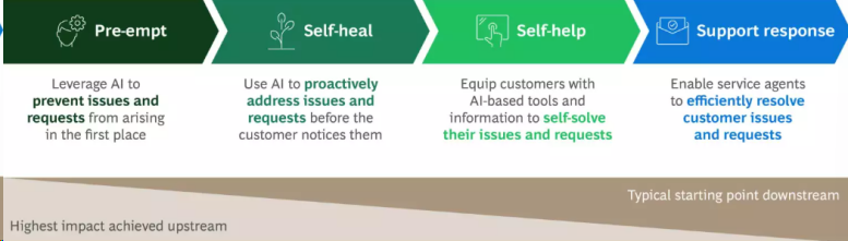 大多数 AI 部署都始于支持响应环节,例如缩短平均处理时间、为坐席提供下一步最佳行动建议、或自动生成通话摘要。尽管代理型 AI(agentic AI)能在四个阶段都带来价值,其最高价值通常体现在预先防范(pre-empt)和自愈系统(self-heal)的能力上。