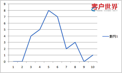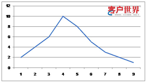 首先我们看到频次表对呼叫中心分析的运用。利用最小方差管理法时,经常要制作频次表来进行分析。频次表其实是一张很简单的图,例如你统计了你同事每天到公司上班所需的时间:5分钟之内的,有2个;10分钟的有4个;15分钟的有6个;20分钟的有10个;25分钟的有8个;30分钟的有5个;35分钟的有3个;40分钟的有2个;超过40分钟的有1个。这时你画一张频次表,就会得到下面的图(纵坐标代表人数;横坐标代表所花时间):