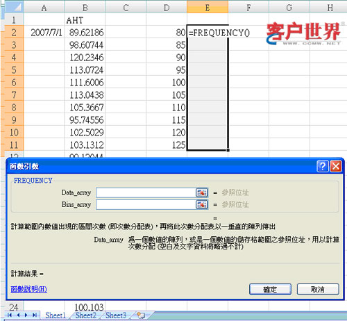 这就是微软产品最特别的地方:你不能按“确定”这个键,如果按“确定”,你就死定了!笔者曾经为这件事,研究了好久,整个Help的帮助画面,也没说要怎么做,终于在一个地方找到:必须同时按三个键:Shift、Ctrl和回车(Enter)。同时按下这三个键,就会得到你要的频次,如下图的E这个数列。