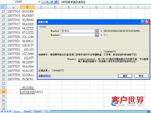 标准差是最小方差管理法高度依赖的指标,计算方法很简单,在EXCEL里面,只要利用“STDEV”函数,选中你要计算标准差的数列,如下图,我们要计算7月1号到30号平均处理时长的标准差,7月1号到30号平均处理时长的数据,就是B2到B31这数列,只要选中这数列,按“确定”,就会得出标准差。