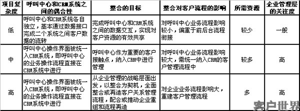 表一:呼叫中心和CRM整合项目的分类