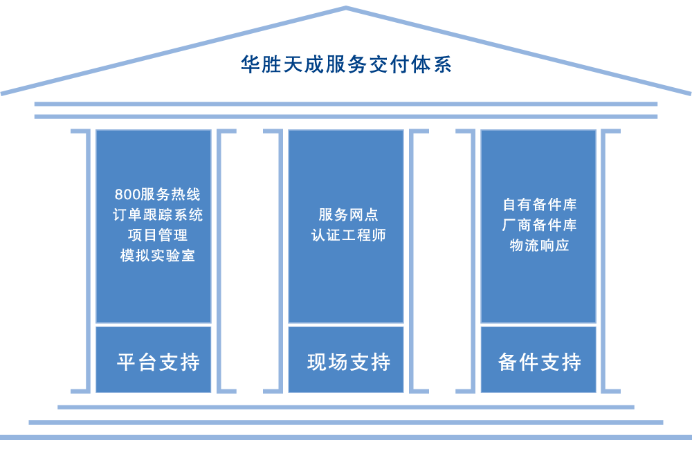 为了完善上述的“端到端”的服务能力,华胜天成作为国内最早提出“服务产品化”的企业,已经形成了完善和成熟的服务交付体系。根据IT服务的特点,华胜天成的服务交付体系由平台支持、备件支持和现场支持组成,形成了一个面对客户的、可提供360度的全方位的服务体系。