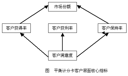 卡普兰和诺顿在《平衡记分卡》一书中,提出了客户层面的核心指标:市场份额、客户保持率、客户获得率、客户满意度和客户获利率。这些指标可以组成一个因果关系链,如下图。