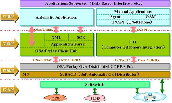 系统以包交换网络为承载网络,承载网络灵活、多样的组网能力为呼叫中心提供了高效的接入能力,LAN、DSL、Wireless LAN等均是可选的接入方式。