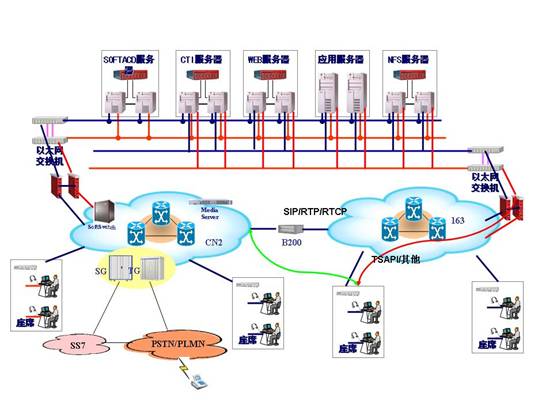 客户座席可以分布在不同的地点,集中在电信机房的座席可以直接部署到CN2网上,分布在客户处的座席,可以部署在各地市专网上或者163城域网上。部署在163网和专网上的座席,语音流和SIP协议通过宽带接入网关 B200接入到CN2网中,数据流通过163网和中心服务器交互,部署在各地市专网上的座席的数据流通过地市专网直接接入163城域网核心网同中心服务器交互。