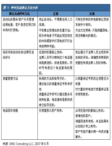 在计算一次呼叫解决率和电话咨询解决率中,最大的困难是,在决定客户事务处理中的问题是否被完全解决。自从联络中心出现以后。经理们就开始争论这个问题了。表1给出了一些方法来计算咨询完成量。